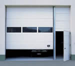Porta sezionale a uso industriale, pannelli coibentati con telaio in alluminio e sezioni vetrate.