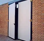 Portone industriale da esterno per uscita di sicurezza, incernierato a telaio autoportante.
